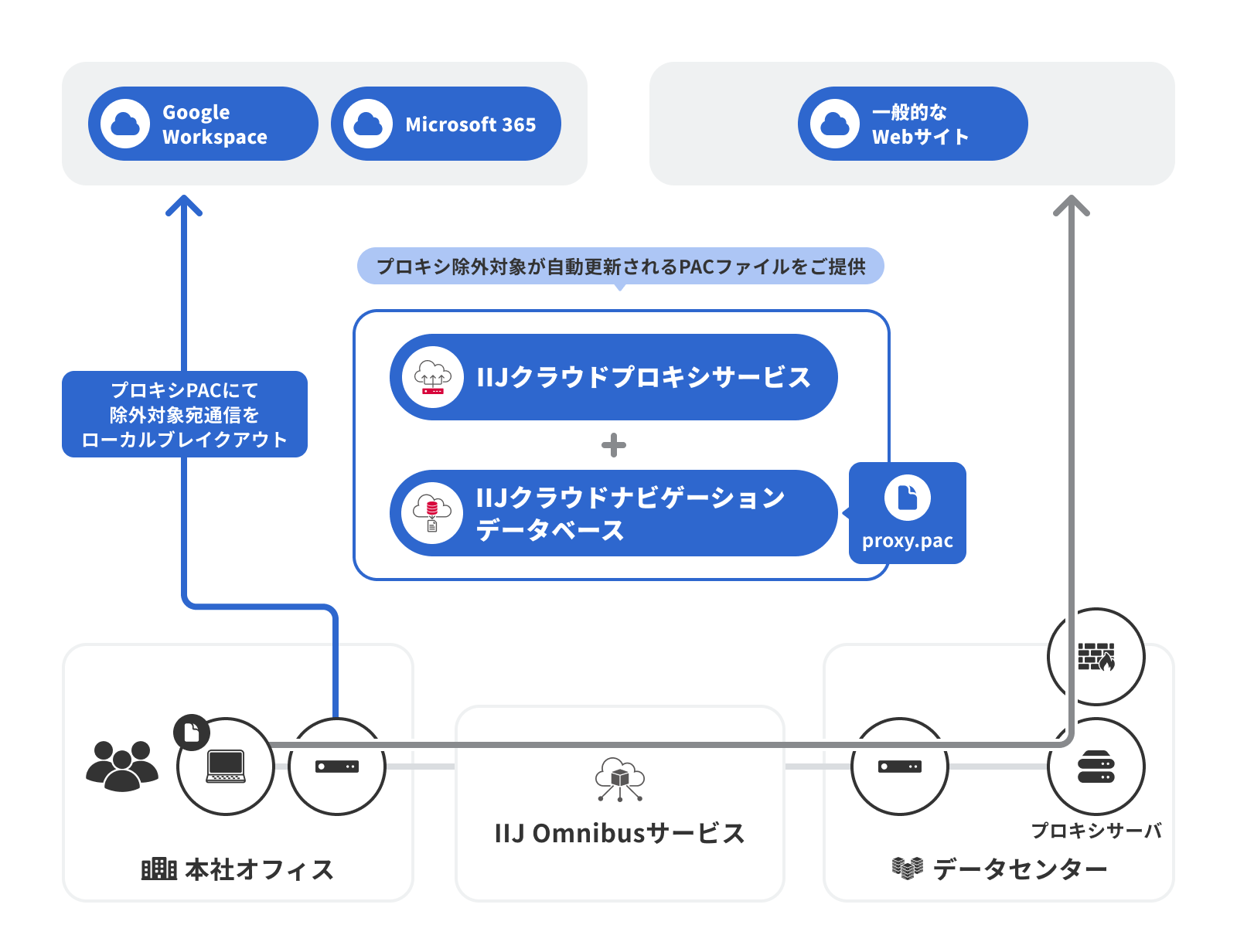 プロキシサーバを利用している場合、プロキシ設定が優先されるため、ローカルブレイクアウトの実現は困難でした。この課題を解決する方法として、IIJでは、SaaSの最新の宛先情報を自動で追従し、プロキシ除外対象として更新されるPACファイルを提供しています。これにより、自社でプロキシサーバを利用している場合でも、宛先更新作業の負荷なくローカルブレイクアウトが可能になります。本機能は「IIJクラウドプロキシサービス」と「IIJクラウドナビゲーションデータベース」を連携し提供します。