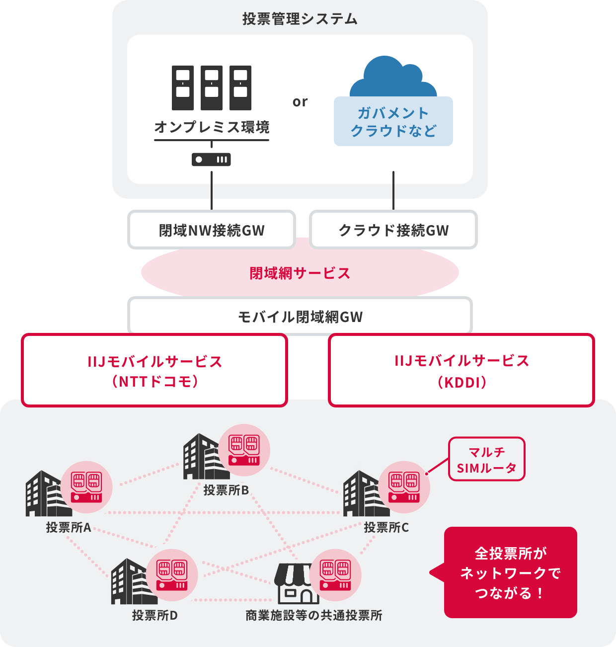 IIJの「選挙事務ネットワークソリューション」は、マルチキャリアのSIMを用いた閉域ネットワークで全投票所を無線で接続し、「共通投票所」運営を支えるネットワーク基盤を構築します。インターネットを介さない閉域環境のため、安心・安全にご利用いただけます。